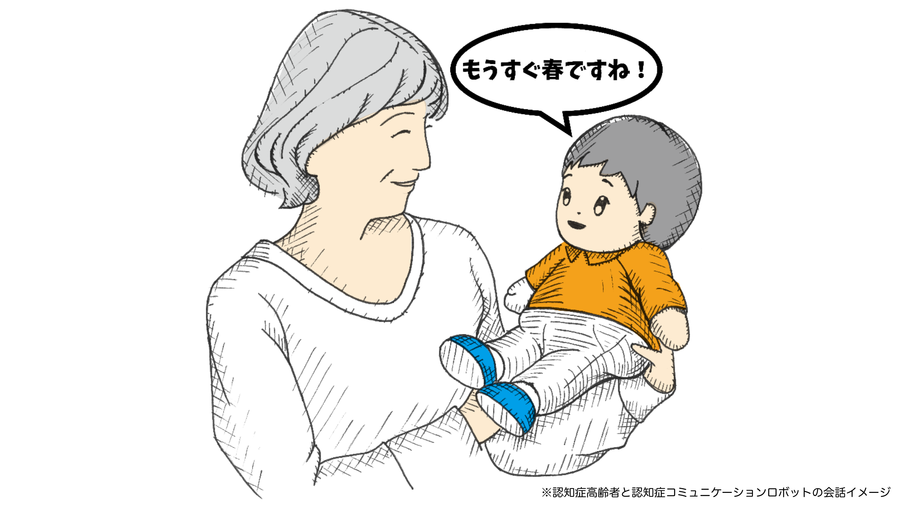 独自開発の認知症対話システム(2022年9月15日に特許登録済み)を搭載した、AIを活用したぬいぐるみ型のコミュニケーションロボットです。認知症高齢者の方にロボットとの会話や歌やクイズなどを楽しんでいただくことにより、以下の実現を目指しています。