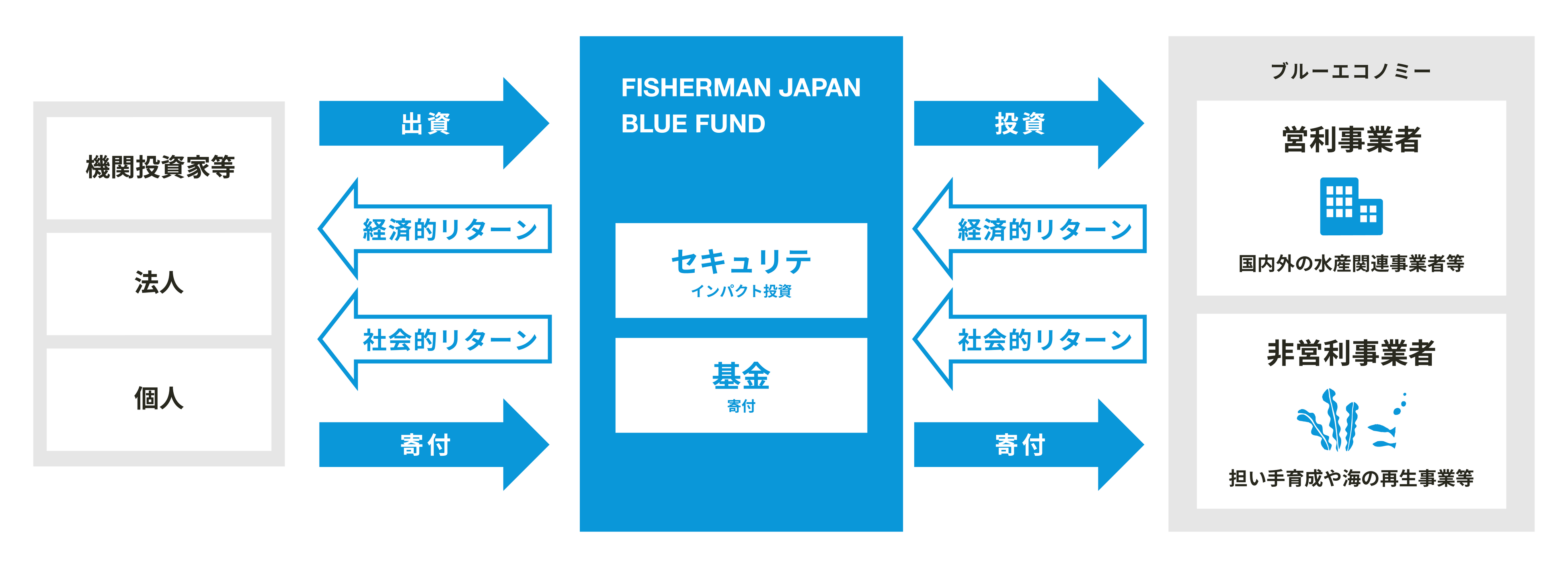 海を守りながら利用することで経済や社会全体をサステナブル(持続可能)にする「ブルーエコノミー」の推進を目的とし、フィッシャーマン・ジャパンとミュージックセキュリティーズが2023年に設立したファンドです。経済的なリターンの獲得だけでなく、投資を通じて社会的課題の解決を目指す「インパクト投資」を行います。海洋環境保全のための海のDX化、サステナブルな養殖エサの開発、海洋プラスチックの回収・リサイクル、海のサーキュラーエコノミーの実現、サステナブルシーフードの流通販売など、幅広い事業を投資対象とします。