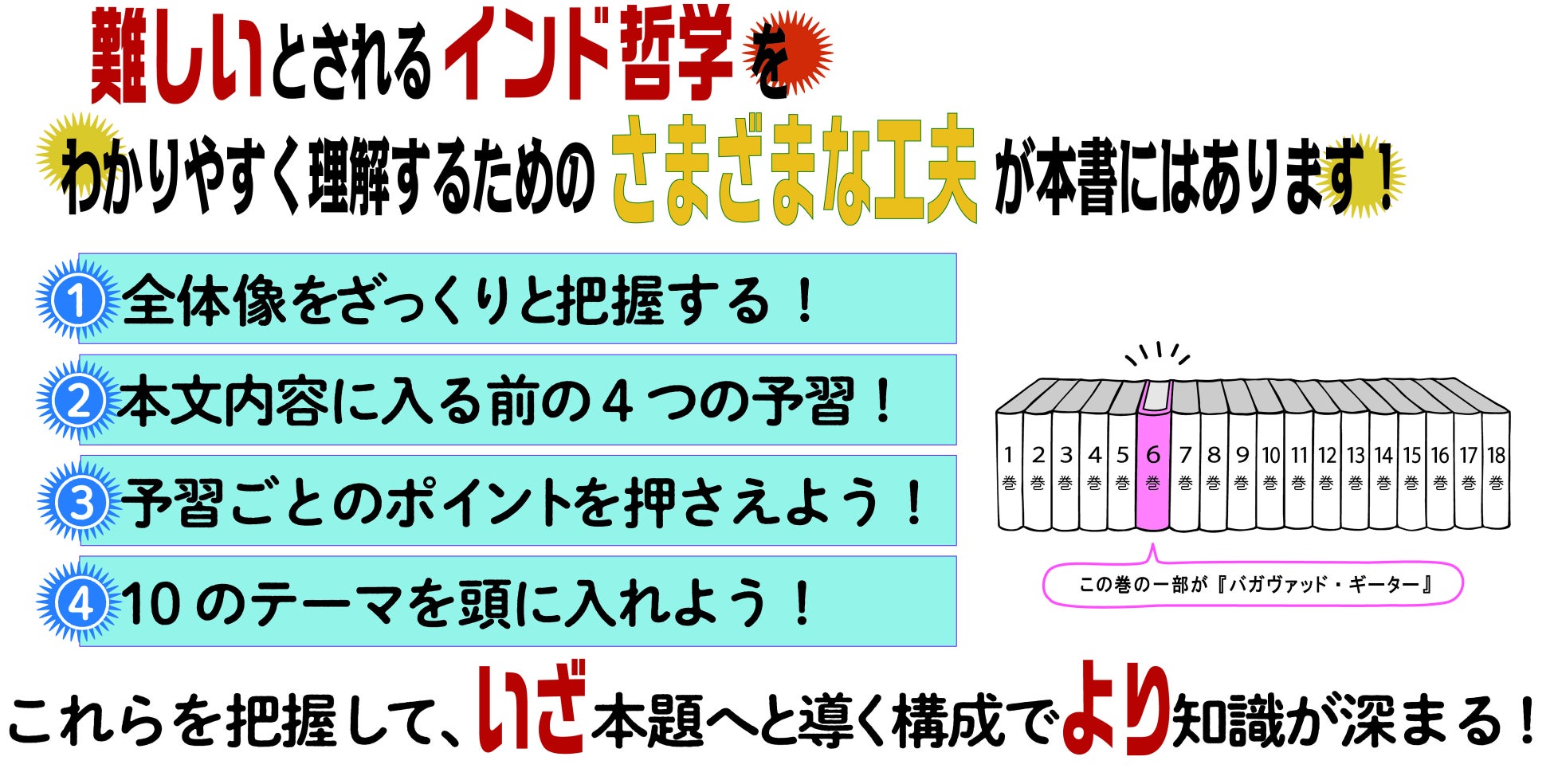 インド哲学の最高の教えにして、インドのモディ首相、マハトマ・ガンジー、ヘルマン・ヘッセ、カール・グスタフ・ユングなど、多くの偉人が生きる拠り所としてきた聖典の入門ガイドです。「そもそも、この物語がどういうものか?」という舞台設定や登場人物をわかりやすく整理、まずは物語全体の見取り図を示しながら、読者を『バガヴァッド・ギーター』の世界へ引き込みます。『バガヴァッド・ギーター』を初めて読む人も、読むのに挫折した人も、物語の主人公であるアルジュナがかかえる苦悩を通して、「自分が抱える苦しさの原因は?」「なぜこのようなことが自分にばかり起きるのだろうか?」といった生きていると必ず直面する問いかけへの理解を深めることが可能となります。