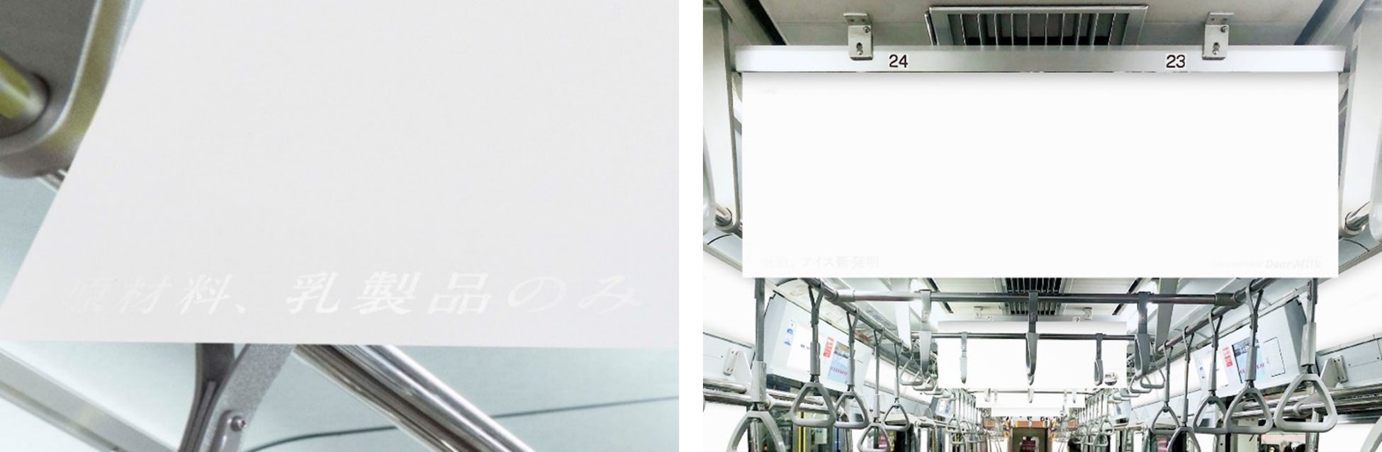 4月にも第1弾として、原材料は乳製品のみを体現した「何も足さない」真っ白な広告で東急東横線の車両内をジャックし、SNS上では「東横線に乗ったら車両内が真っ白で驚いた」「近くでよく見たら商品名が書いてあって面白かった」等と多くの反響の声を頂きました。この度も、独自技術による原材料とこだわりの製法により、季節や流行のニーズに応じて様々な素材を足していくアイスクリームの市場トレンドとは真逆である、素材をそぎ落としていく“引き算的”思想で完成した「明治 Dear Milk」の斬新さが、体験広告を通して伝わることを願っています。商品と同じ発想で、伝えたいメッセージのみにそぎ落とした明治のこだわりの広告を、是非探して体験してみてください。