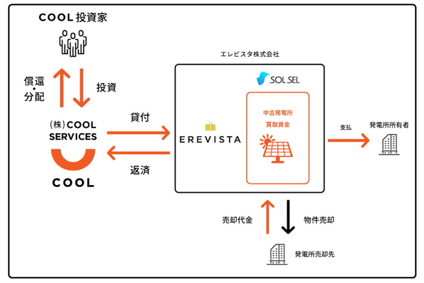 お客様より投資いただいた当ファンドの資金は、同じくZUUグループに属する貸金業者である株式会社COOL SERVICES(東京都世田谷区:代表取締役 伊藤 謙)からエレビスタに対して貸し付けられ、エレビスタが展開するSOLSEL事業として稼働実績のある中古の太陽光発電所の仕入資金の一部として使用されます
