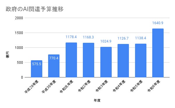 政府も生成AI関連に注力しており、内閣府の第5回AI戦略会議では、令和6年度概算要求においてAI関連予算を前年度比約44%増の約1,640.9億円としました。特に生成AI関連予算は約728億円となっており、生成AI開発への強い意欲を示しています。