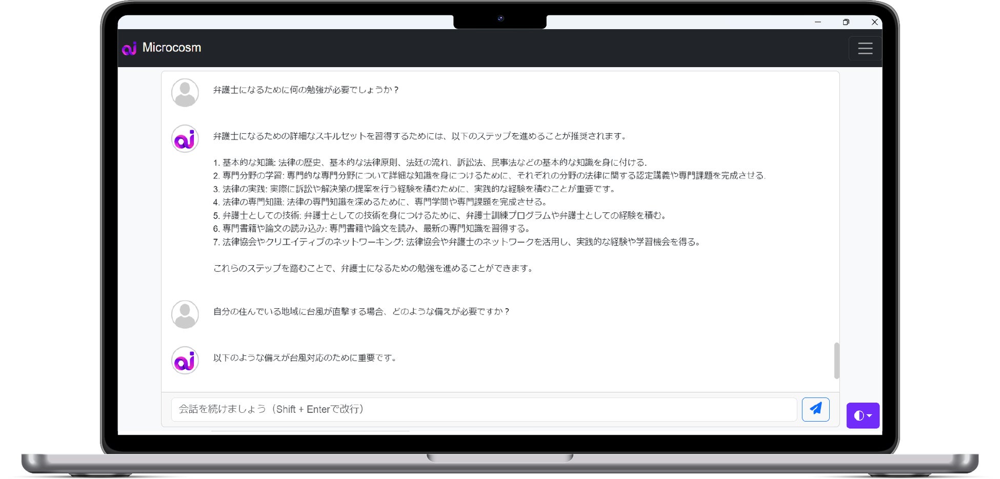 Microcosmは、社内専用の生成AIシステムをローカル環境で構築するため、クラウド型AIシステムに見られるデータ流出リスクを完全に排除します。企業の機密情報を外部に出すことなく、安全かつ効率的にAIを活用できる点が大きな特徴です。