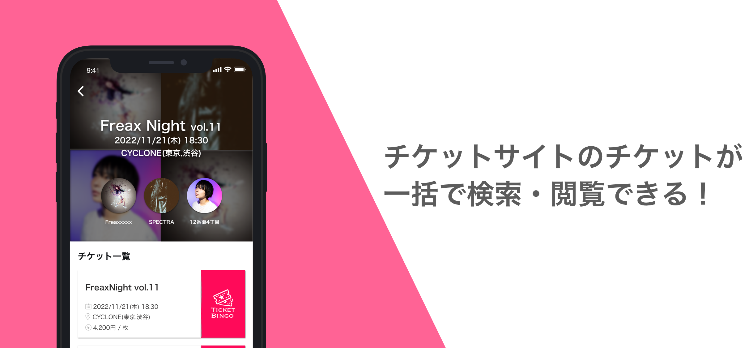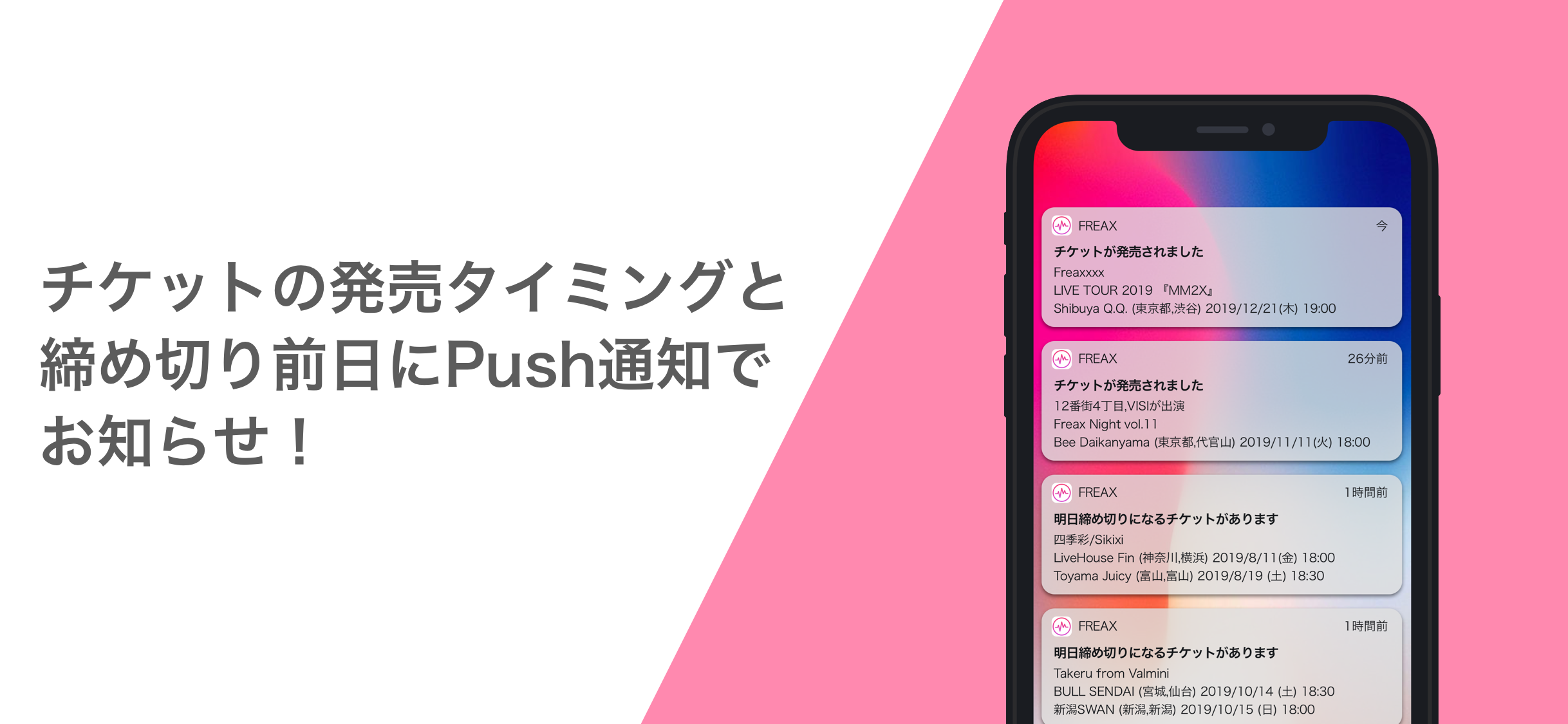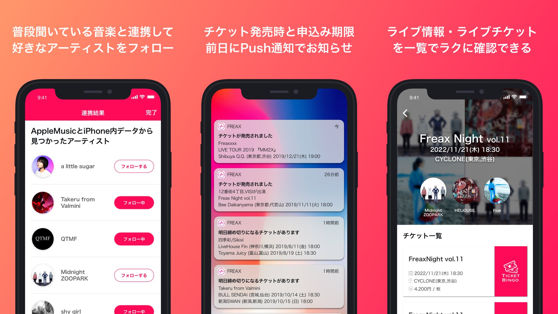 「Freax」は、2019年5月にリリースされたライブ・フェスなどのリアルの音楽イベントに行くまでの手間を解決し、熱量の高いファンの皆様がもっとライブ・フェスに行きやすくなるアプリです。随時ライブ・フェスの情報が更新され、自分が受け取りたい情報がプッシュ通知でリマインドされるため、ライブ・チケット情報の見逃しや買い忘れをなくします。