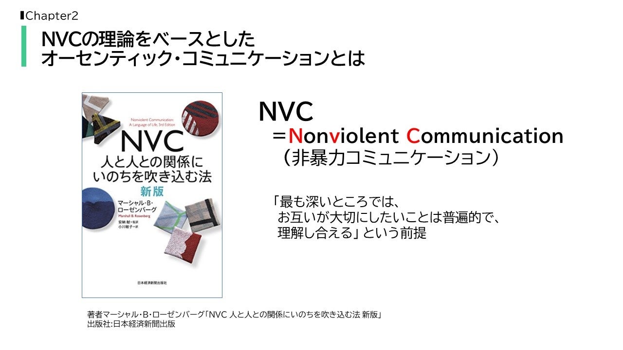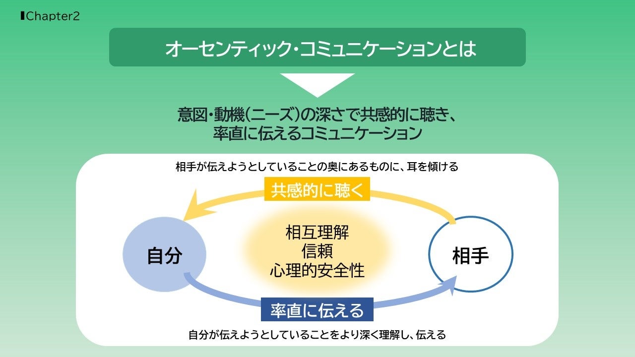 オーセンティック・コミュニケーションは、NVC*の知見・ノウハウをビジネスパーソン向けに編成しており、心理的安全性の高い職場をつくる鍵となります。