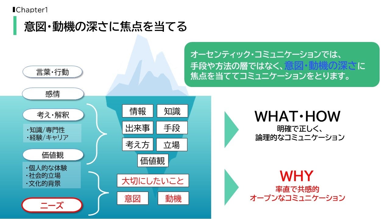 オーセンティック・コミュニケーションは「自分の感情」を入口に、その奥にある「本質的な意図」に気づき、それを率直に伝え、共感的に聴きあうコミュニケーション手法です。