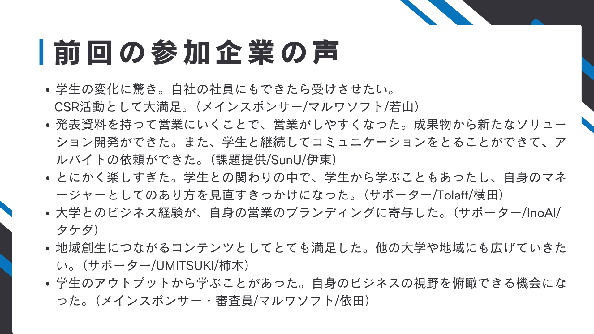 優勝チームには賞金10万円を贈呈。企業からのフィードバックや交流の場も設けられ、学生にとっては圧倒的な実践と成長のチャンスとなります。