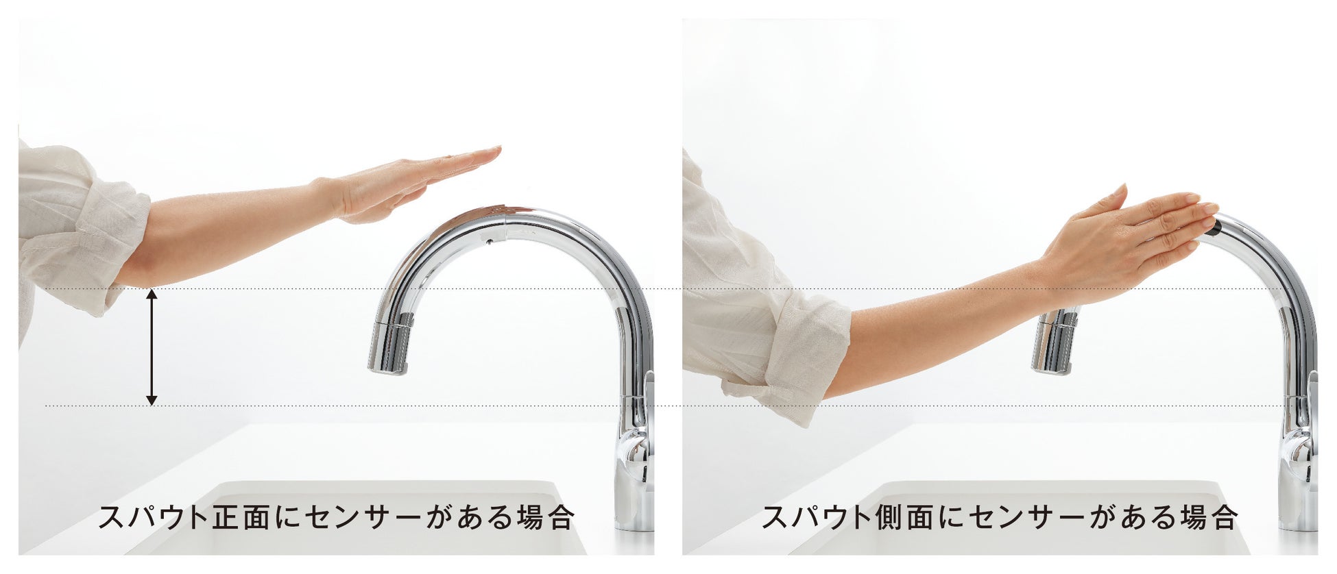操作時の肘の位置やレバー操作など使う人の動作に着目。動線を短くすることで、腕を必要以上に持ち上げることなく、シンク内からセンサーまでスムーズな動作で使用いただけます。安心の非接触であることはもちろん、側面にセンサーを配することで手についた洗剤や水が水栓に垂れづらく、水回りをきれいに保つこともできます。キッチンの小さなストレスを軽減するために、使い心地を追求しました。