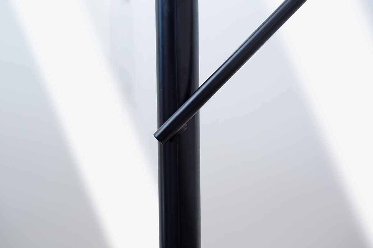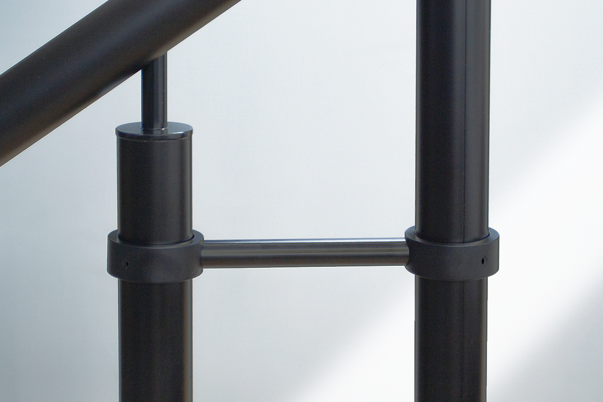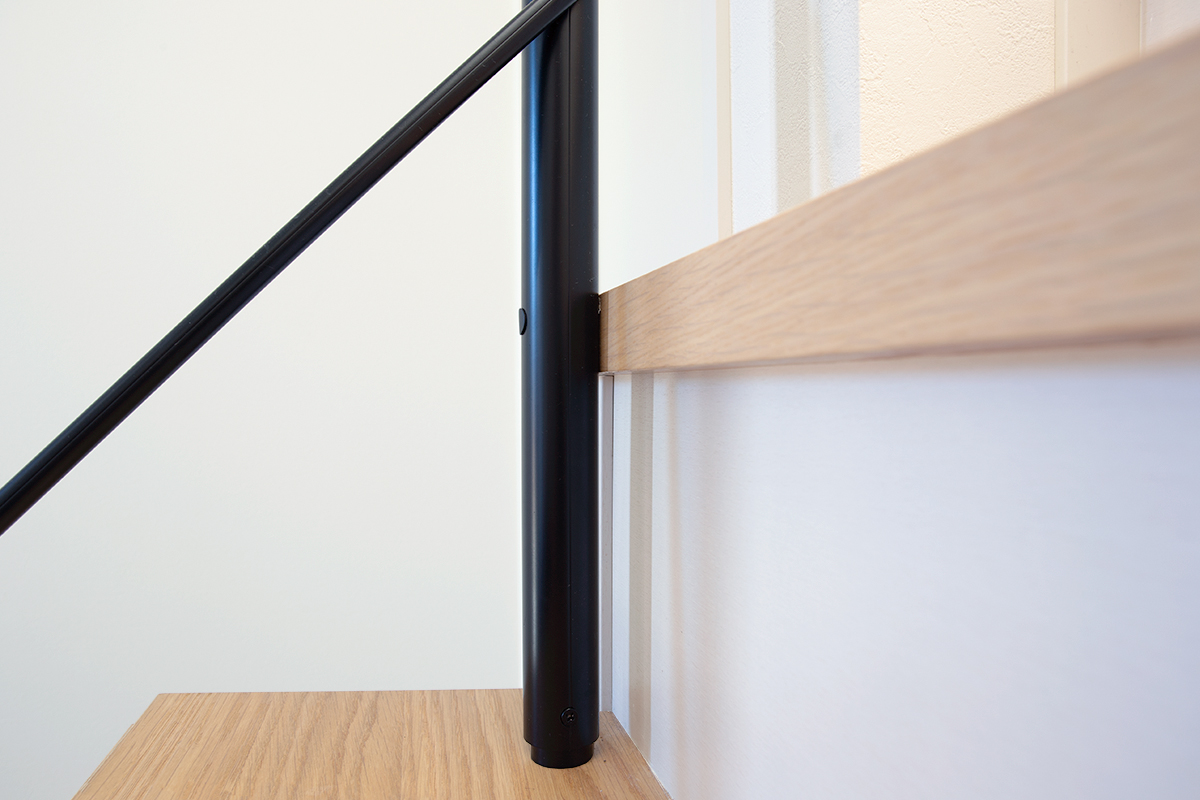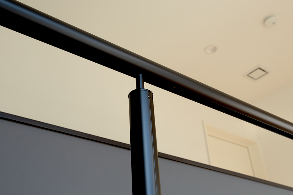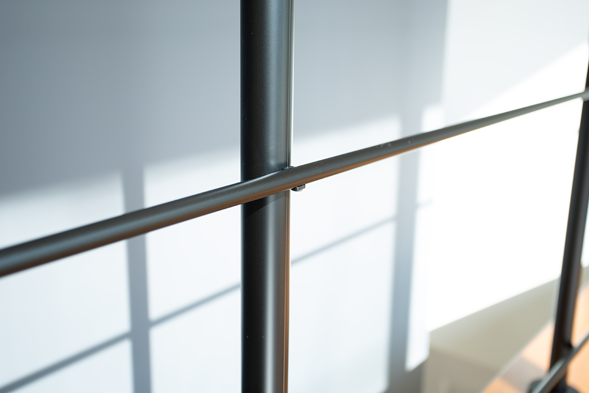 Aluteは量産型の手摺でありながら、工業製品の野暮ったさを感じさせない、造作の鉄骨手摺のようなプレーンな佇まいを目指して開発されました。細部にわたるまで無駄な要素をそぎ落としたことで、笠木と支柱、中残の1本ずつが「丁寧な線」を描いるかのように存在します。円形の笠木は握ったときに心地よい直径35mmのサイズになっています。