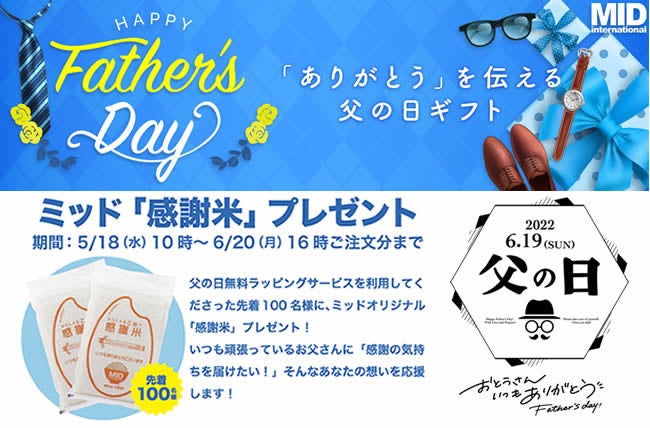 大きいサイズのメンズ服通販サイト「ミッド・インターナショナル」( https://www.bigsize.co.jp/ )を運営する株式会社ミッド・インターナショナル(本社:岐阜県岐阜市、代表取締役:宮崎 弘司)は、5月18日(水)より大きいサイズのお父さんにHAPPYをお届けする、「父の日ギフト無料ラッピング・無料メッセージカードサービス」をインターネット通販サイト「MIDinternational(ミッド・インターナショナル)」にて、6月20日(月)16時ご注文分まで開催。父の日ギフト無料ラッピングをご利用いただいた先着100名さまに、幻のお米、岐阜県産ハツシモを使用した「感謝米」をプレゼントするキャンペーンを開催中。