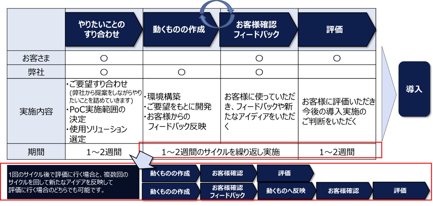 最初に、お客様からLTV向上のためにどのようなことを実施したいのかなどの要望をヒアリングし、PoCの実施範囲や実施するソリューションの選定などを検討します。次に、検討結果を踏まえてNTTデータ先端技術がPoC環境を構築し、プロトタイプを開発します。プロトタイプを試用したお客様のフィードバック内容をプロトタイプへ反映、評価することを繰り返し行い、最終的に、本番への導入に向けてブラッシュアップをします。