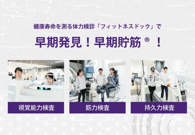 「フィットネスドック」は、視力・筋力・持久力を数値化することで、基礎体力を見える化する体力版の人間ドックです。体力年齢として個々のデータを明確化し、結果を基に最適なトレーニングプランを作成します。