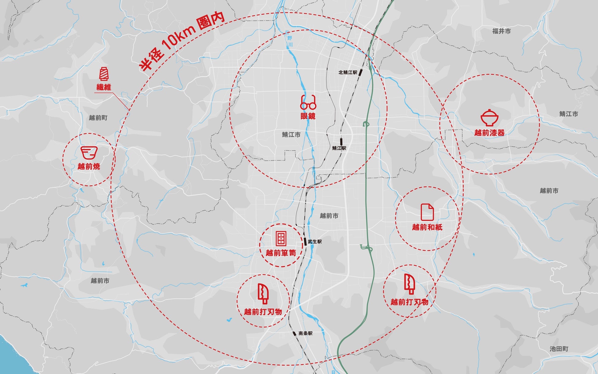 福井県鯖江市・越前市・越前町がある越前鯖江(丹南)エリアは越前5産地として知られ、越前漆器・越前和紙・越前打刃物・越前箪笥・越前焼といった国指定の伝統的工芸品や、眼鏡・繊維といった7つもの地場産業が半径10km圏内に集まる、全国でも稀有なものづくり集積エリアです。各産地では技術を継承しながら、時代に合わせたものづくりを続けており、最近では次の担い手として移り住む若者も増え、産地には新しい風が吹いています。