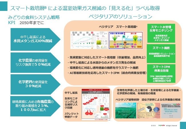 近年の異常気象により農業現場では、従来の栽培暦(地域に即した農作物ごとの生育を栽培方法などとともに示した栽培カレンダー)での対応が困難な状況が生じています。ベジタリアでは、こうした状況に対応すべく、これまで培ってきたスマート農業の知見・実績をもとに、「スマート栽培暦®」として、「農薬削減」「化学肥料削減」「環境配慮」「気候変動」に対応したソリューションを提供しています。