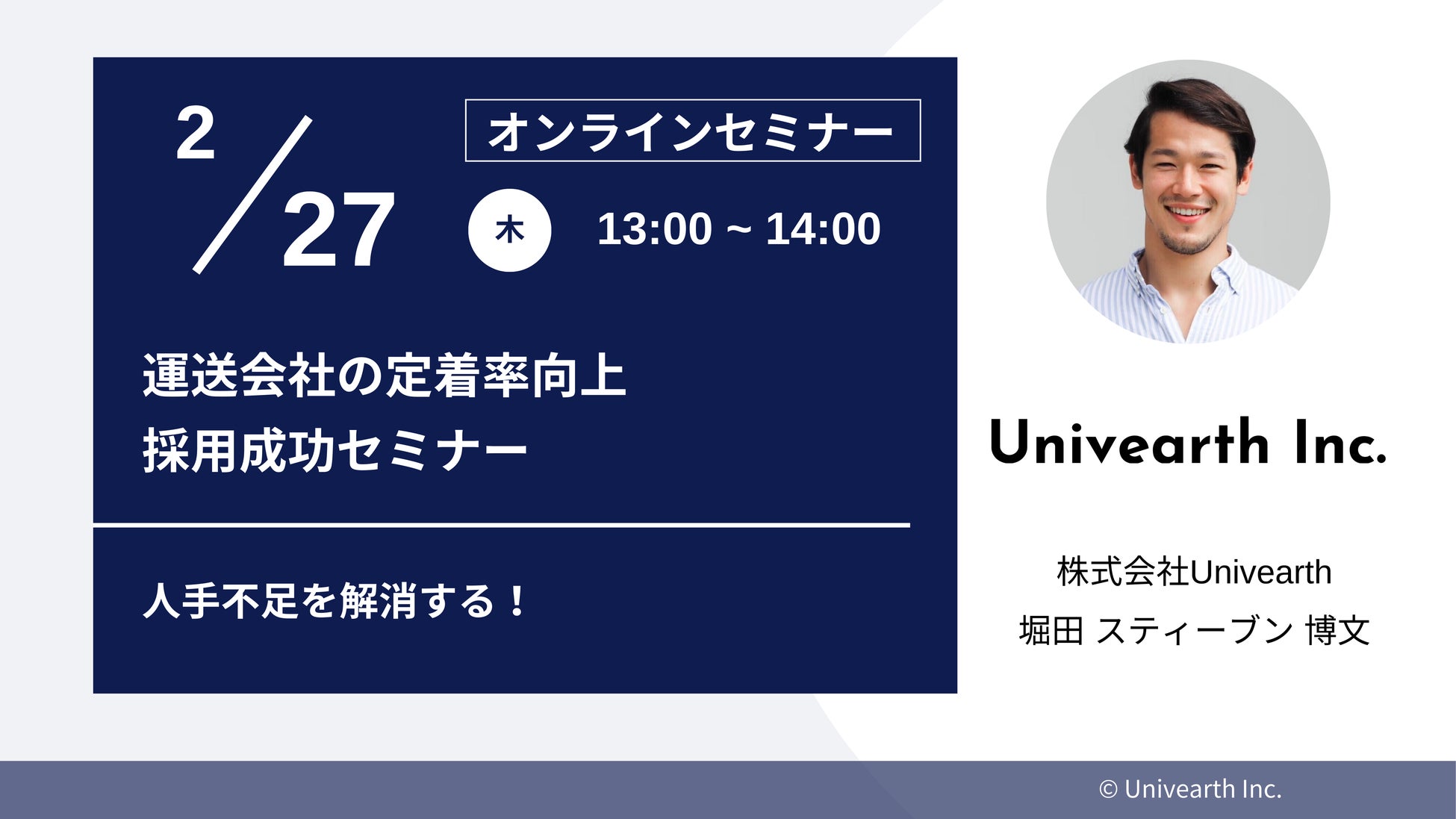 企業の物流戦略支援を行う株式会社Univearth(本社:大阪府大阪市北区、代表取締役:谷口 臨太朗)は、運送業界における深刻な人手不足を解消するため、オンラインセミナー「人手不足を解消する!運送会社の定着率向上&採用成功セミナー」を開催いたします。