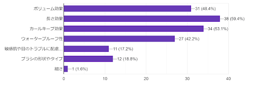 調査の結果、マスカラの「長さ効果」に期待する人が38人と最も多く、つづいて「カールキープ力」や「ボリューム効果」を重視する人も多いことが分かりました。期待する効果や性能から、マスカラを選ぶことが大切です。