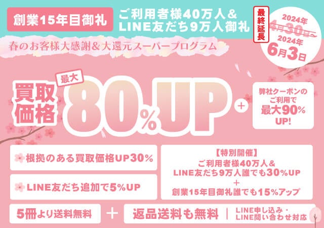 弊社は、2024年で創業15年目を迎え、買取ご利用者様40万名、総取扱冊数3600万冊以上になりました。これらを記念して、またお客様への御礼と致しまして、買取価格アップキャンペーンを開催致します!