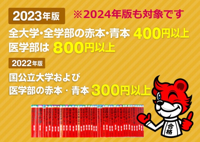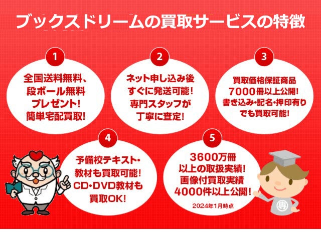 買取では、「学参プラザ(受験参考書・問題集・赤本・予備校テキスト・教材の専門買取店)」「専門書アカデミー(専門書・医学書・大学教科書・資格試験参考書・問題集・予備校テキスト・教材の専門買取店)」「メディカルマイスター(医学書・医療系書籍・予備校テキスト・教材の専門買取店)」の3サイトを展開しています。インターネットから申し込みをして宅配便の着払いで送るだけの簡単買取。全国から送料無料で買取可能。ご希望の方には段ボール無料送付サービスも行っています。