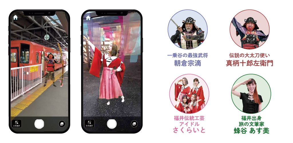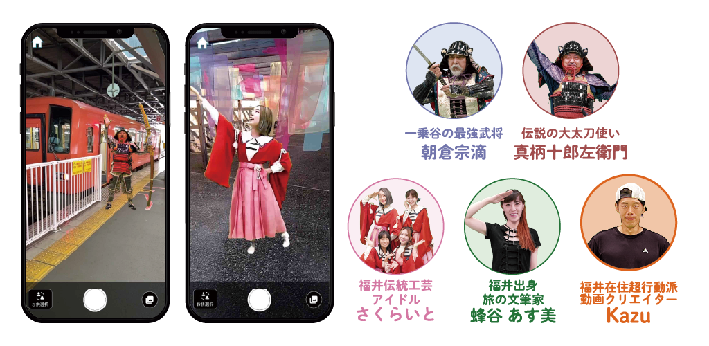 福井出身の「旅の文筆家 蜂谷あす美さん」「ご当地アイドル さくらいと さん」がメンバーとして登場し、素敵なARメッセージで旅をサポートします。