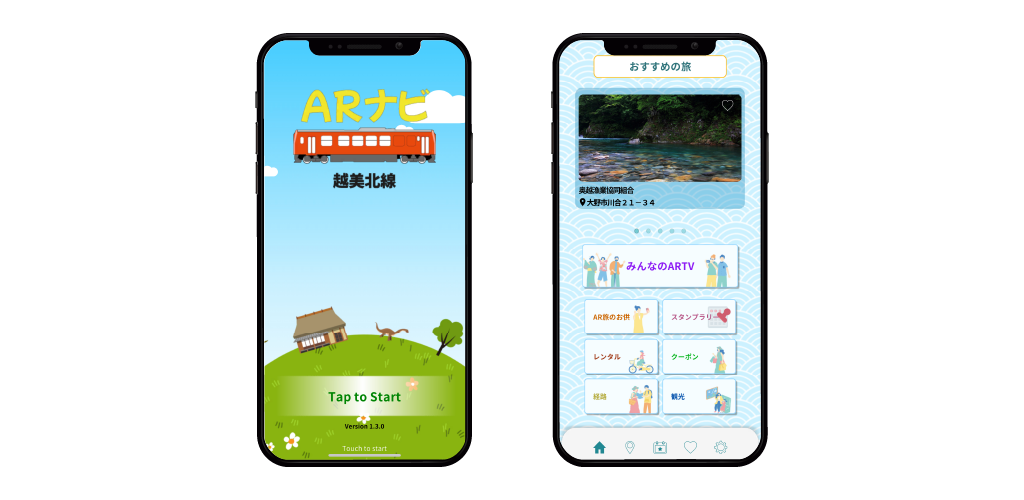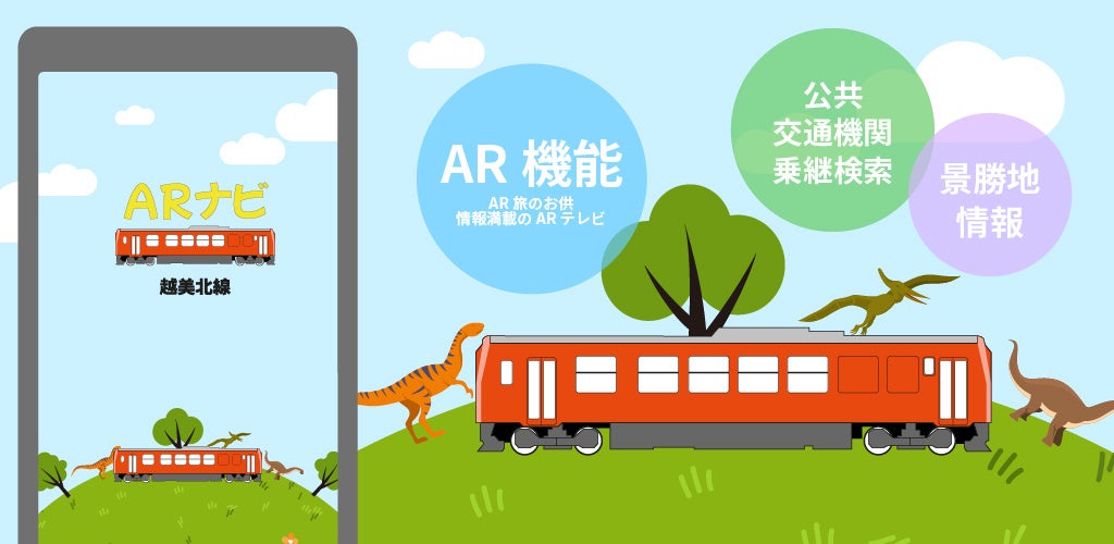 本アプリは、越美北線の駅や車内にてARキャラクター(旅のお供)の沿線案内が楽しめるほか、旬の情報や観光お役立ち情報を伝える短編ビデオ(みんなのAR-TV)が視聴できます。