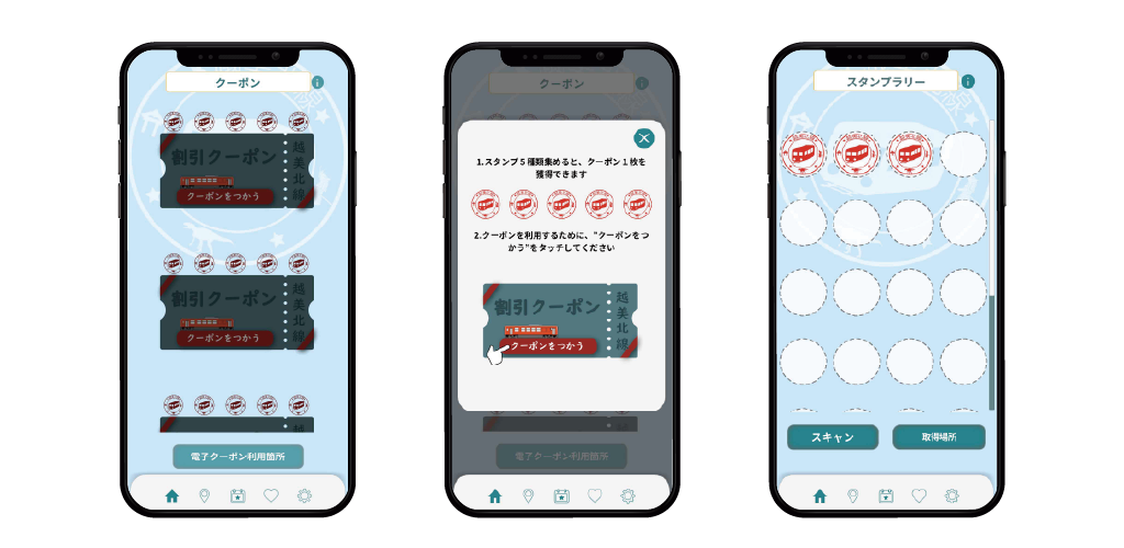 さらに、デジタルスタンプラリーに参加して各スポットを周遊すると、おトクな電子クーポンが入手できます。電子クーポンは沿線の様々なショップで利用できるので、旅がますます楽しくなります。アプリを片手に、ぜひ越美北線の沿線を散策してみてください。
