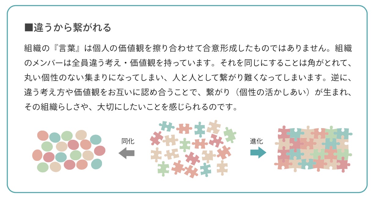 - 言語化へのプロセスを共有することにより、お互いの違いを理解した多様性のある組織の構築を促進します。