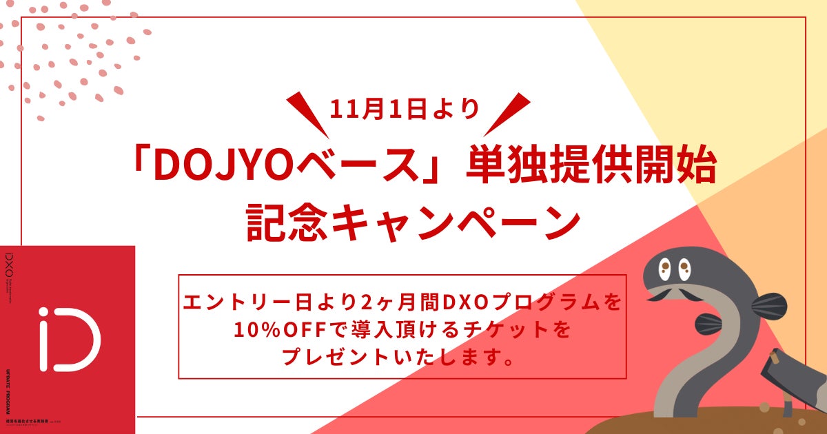 この期間にDOJYOベースの導入についてエントリー頂いた企業様は、エントリー日より2ヶ月間DXOの全プログラムを10%OFFで導入頂けるチケットをプレゼントいたします。