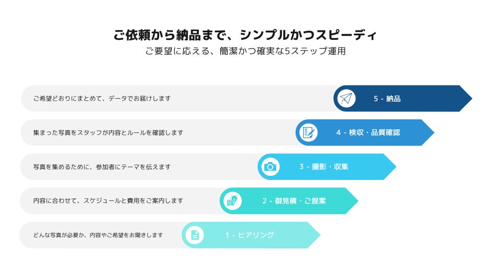 著作権は当社または撮影者に帰属し、契約範囲外での二次利用・再配布は不可とすることで、企業側での権利処理の手間とリスクを大幅に軽減します。