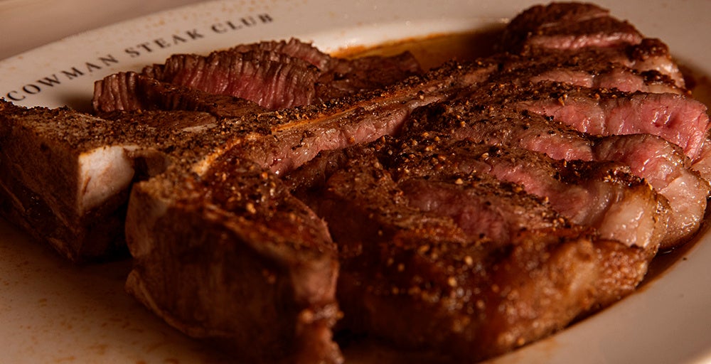 カウマン(牛飼い)の秘密クラブをイメージしたステーキハウス「COWMAN STEAK CLUB」は、ブラックアンガス牛の旨味を最大限に味わえる、ステーキの真骨頂、ポーターハウスをメインに牧場直営だから実現できる適正価格で提供します。ブラックアンガス牛のきめ細かな肉質と深い旨味の魅力を最大限に引き出すべく、 厚切りの肉を 900°Cのオーブンで一気に加熱。表面はカリッと香ばしく、 中はしっとりジューシーに焼き上げ、季節ごとに旬の食材を取り入れたオリジナリティあふれる前菜を添えたコースで提供します。