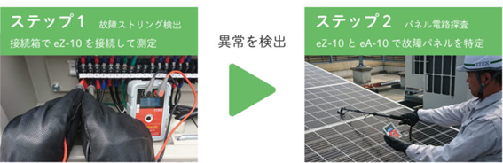 eソラメンテ-Z(eZ-10)により、故障パネルや高抵抗化したケーブルが存在する異常ストリングを絞り込みます。