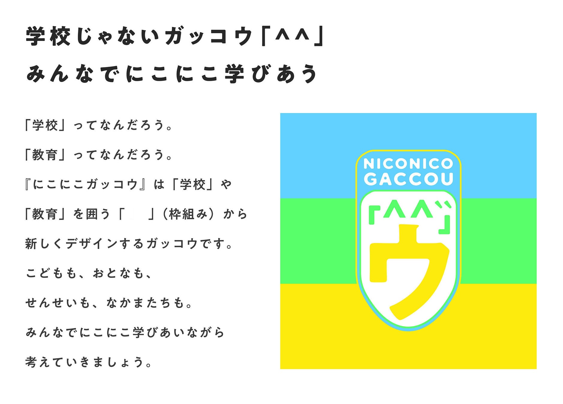 「学校」ってなんだろう。「教育」ってなんだろう。「にこにこガッコウ」は「学校」や「教育」を囲う「 」(枠組み)から新しくデザインするガッコウです。こどもも、おとなも、せんせいも、なかまたちも。みんなでにこにこ学びあいながら考えていきましょう。