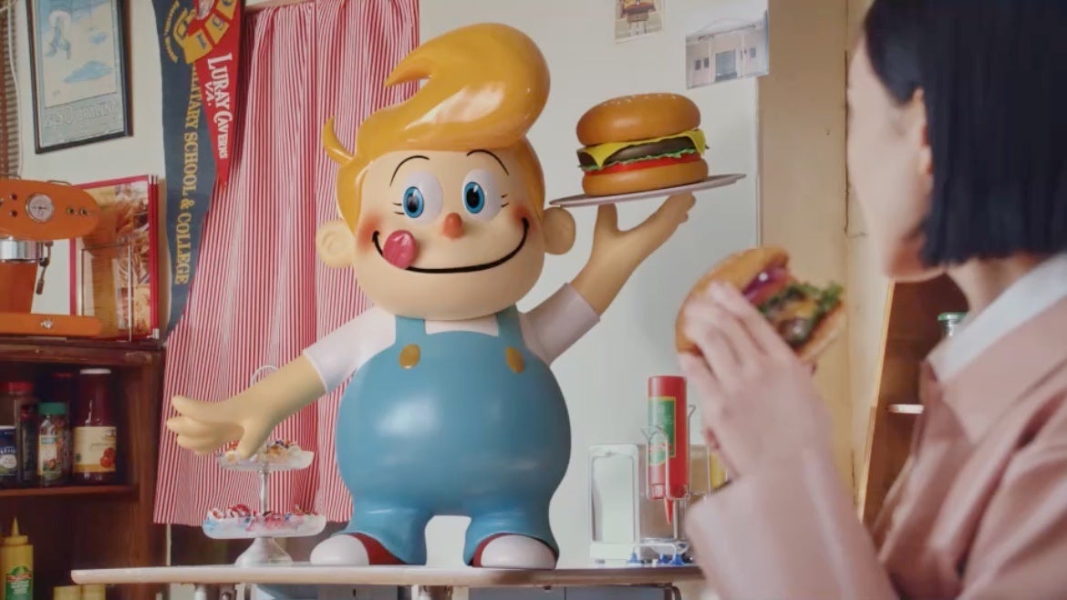 ナチュリズムカラーの服を着てハンバーガーを持った ” ナチュラルボーイ ” (人形)と目が合った藤井さん。