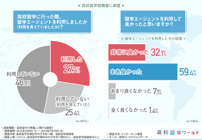 中には、留学前の不安を解消するために留学エージェントの利用を考えている方もいると思いますが、高校留学経験者のどれくらいの方が利用したのでしょうか?