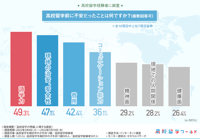 「高校留学前に不安だったことは何ですか?(複数回答可)」と質問したところ、『語学力(学習についていけるかなど)(49.3%)』と回答した方が最も多く、次いで『現地の治安、安全性(47.1%)』『費用(42.4%)』『コミュニケーション能力(現地の人と会話ができるかなど)(36.1%)』『精神面(ホームシックなど)(29.2%)』『現地での人間関係(友達ができるか、差別がないかなど)(28.2%)』『健康面(食事、生活環境など)(26.4%)』と続きました。