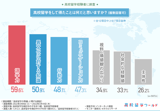 「高校留学をして得たことは何だと思いますか?(複数回答可)」と質問したところ、『語学力(59.6%)』と回答した方が最も多く、次いで『異文化に対する知識(50.9%)』『行動力(48.1%)』『コミュニケーション力(47.3%)』『視野、価値観の広がり(34.9%)』『社会的な経験値(33.7%)』『主体性(26.2%)』と続きました。