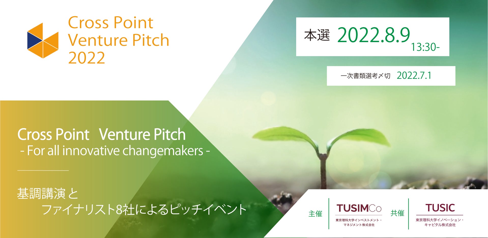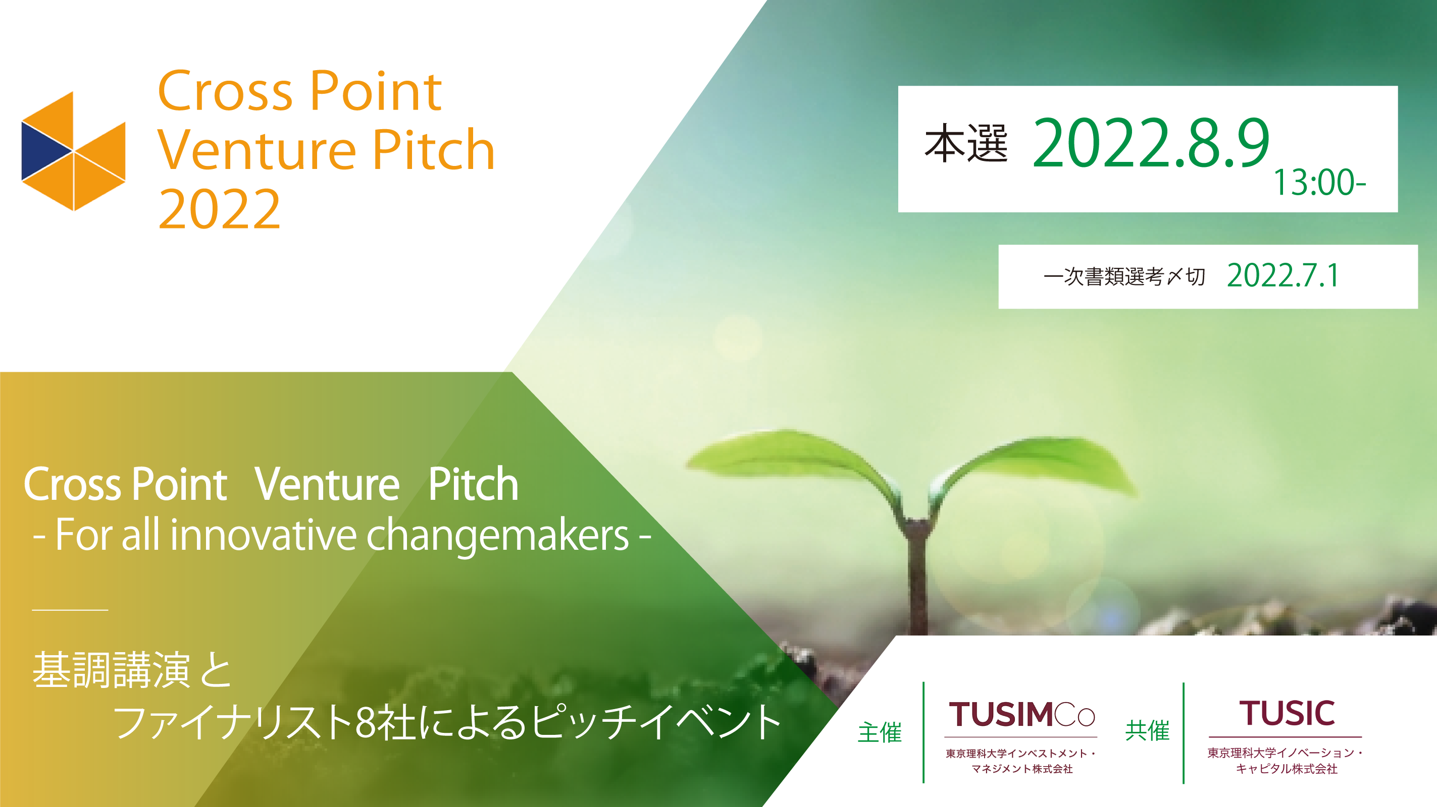 東京理科大学インベストメント・マネジメント株式会社(東京都新宿区、代表取締役:片寄裕市)は、創業前後のスタートアップ企業を対象としたピッチイベント「Cross Point Venture Pitch」2022年大会を2022年8月9日(火)に開催いたします。