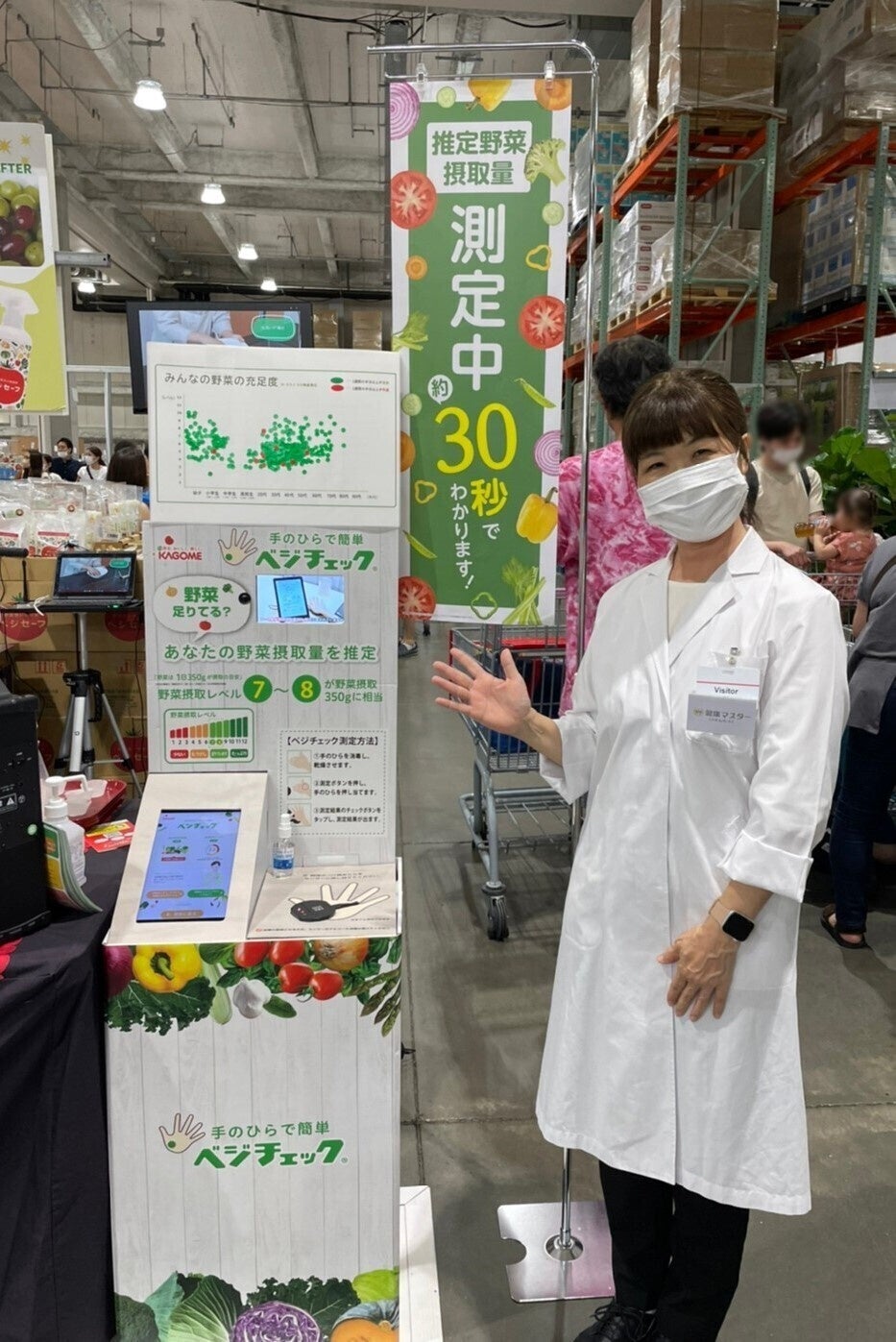 手のひらを30秒あてるだけで自分の野菜摂取量が推定できる!カゴメ株式会社が開発・提供する「べジチェック」を設置して、コストコユーザー様の野菜摂取レベルをチェックいたします。