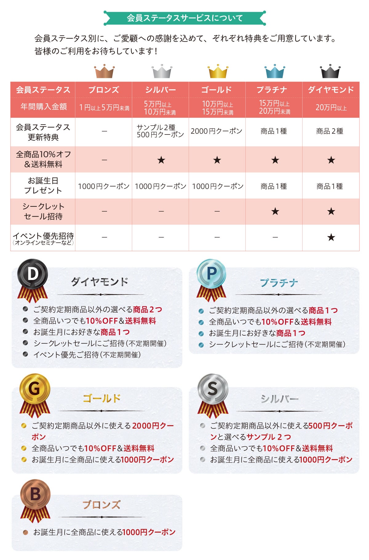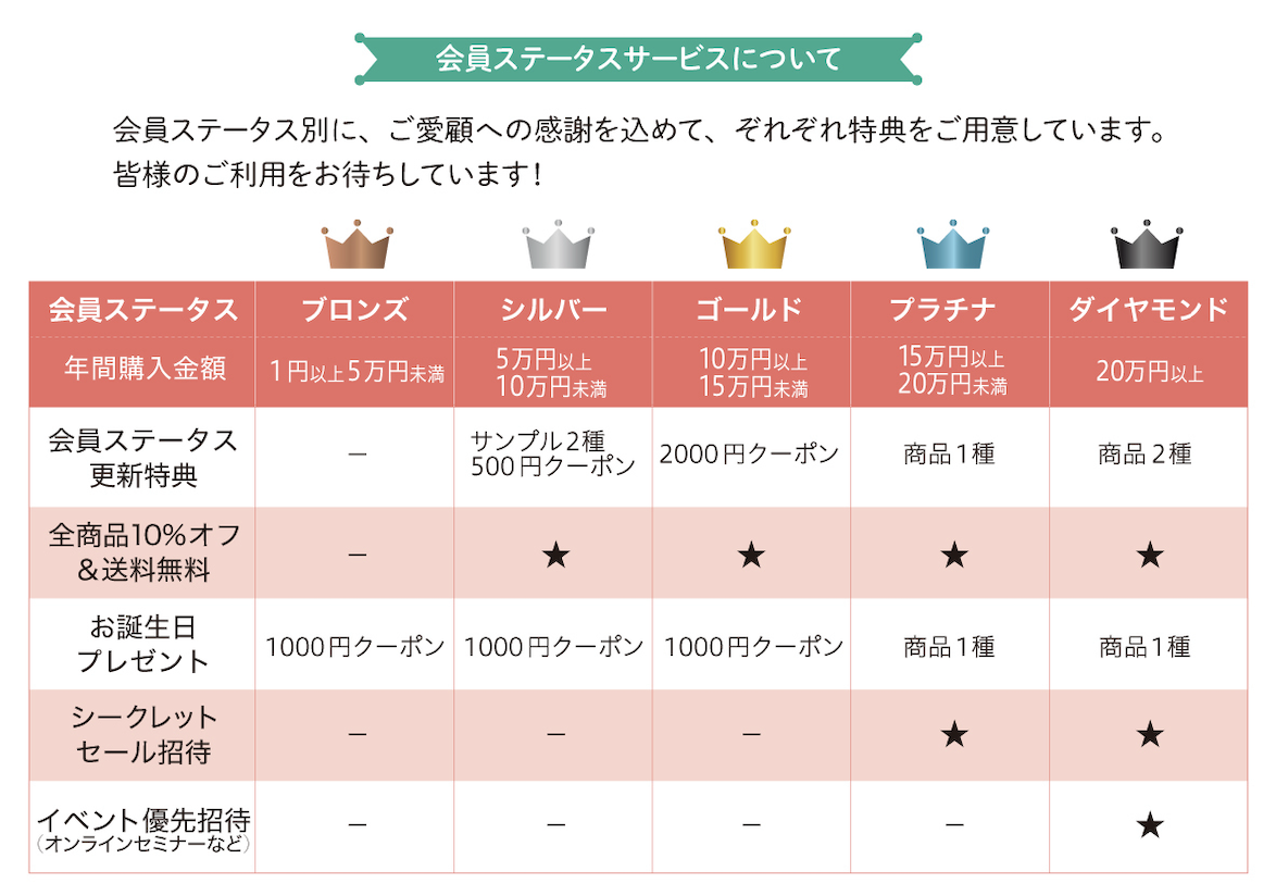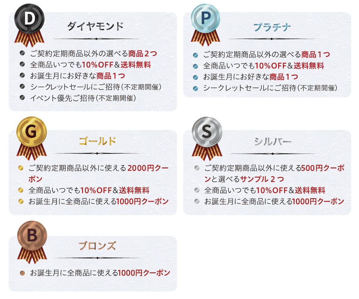 ブロンズ:お誕生日月に全商品に使える1000円クーポンシルバー:ご契約商品以外に使える500円クーポンと選べるサンプル2つ/全商品いつでも10%オフ&送料無料/お誕生日月に全商品に使える1000円クーポン