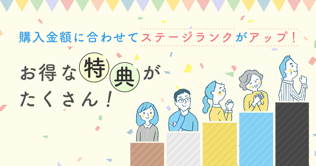 年間累計購入金額に応じた5段階のステージランクを設定し、ステージ毎に各種サービスや特典などを提供いたします