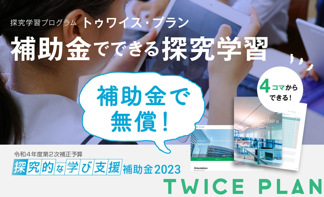 経済産業省の「探究的な学び支援補助金2023」の交付により、弊社の提供する探究学習プログラム『TWICE PLAN 企業インターンワーク』を、学校等の教育機関に無償で提供することが可能となりました。