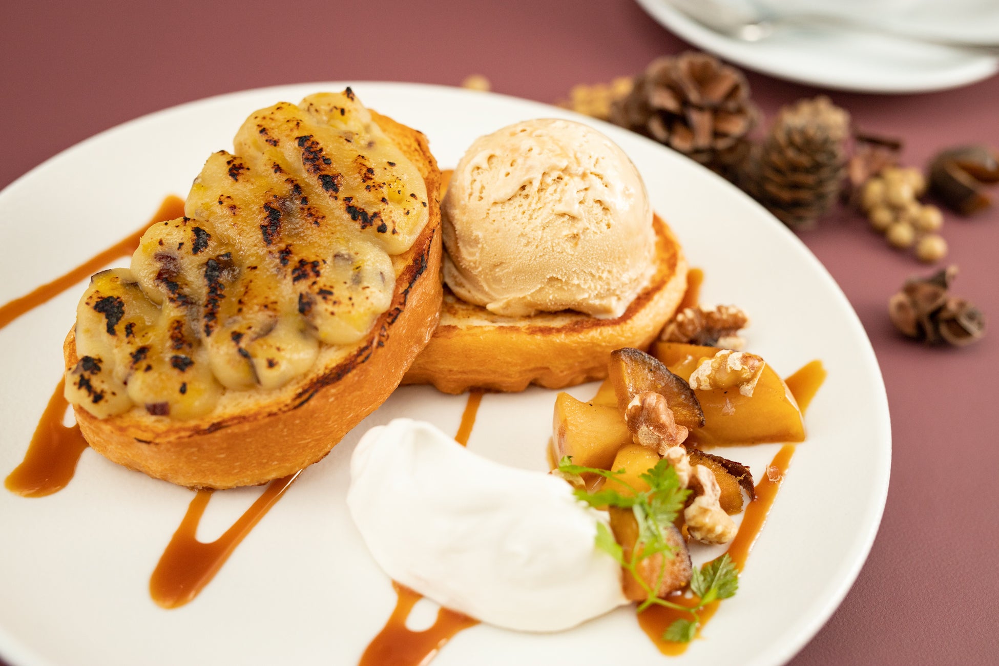 さつまいものブリュレとキャラメリゼしたさつまいも・りんごを添えたフレンチトーストです。