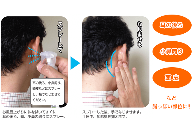お風呂上がりに、脂っぽさが気になる首の後ろ、耳の後ろや頭皮、胸の周り、脂が溜まりやすい小鼻など、全身に2~3プッシュしてなじませます。
