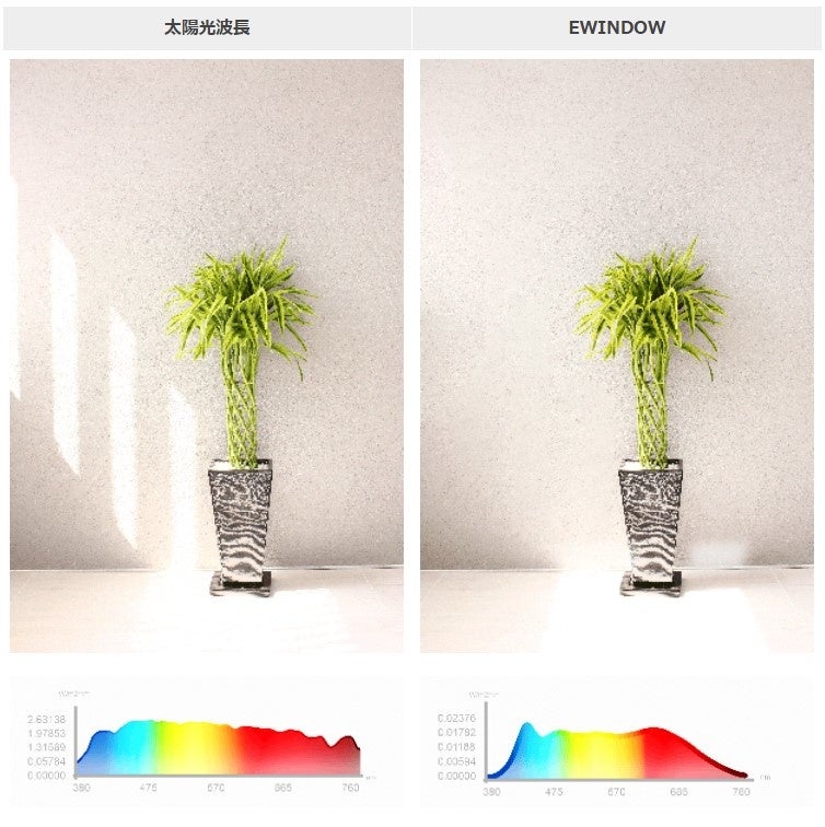 そんな多数の導入を頂いている人気の秘訣は、やはりなんといっても「太陽と同じ波長にこだわりぬいた」こと。ただのインテリア照明ではなく、本当にそこに太陽があるかのようにまっすぐに差しこみ床面を照らす光は、他の天窓風照明とは一線を画すもの。それはその波長の比較を見れば一目瞭然。