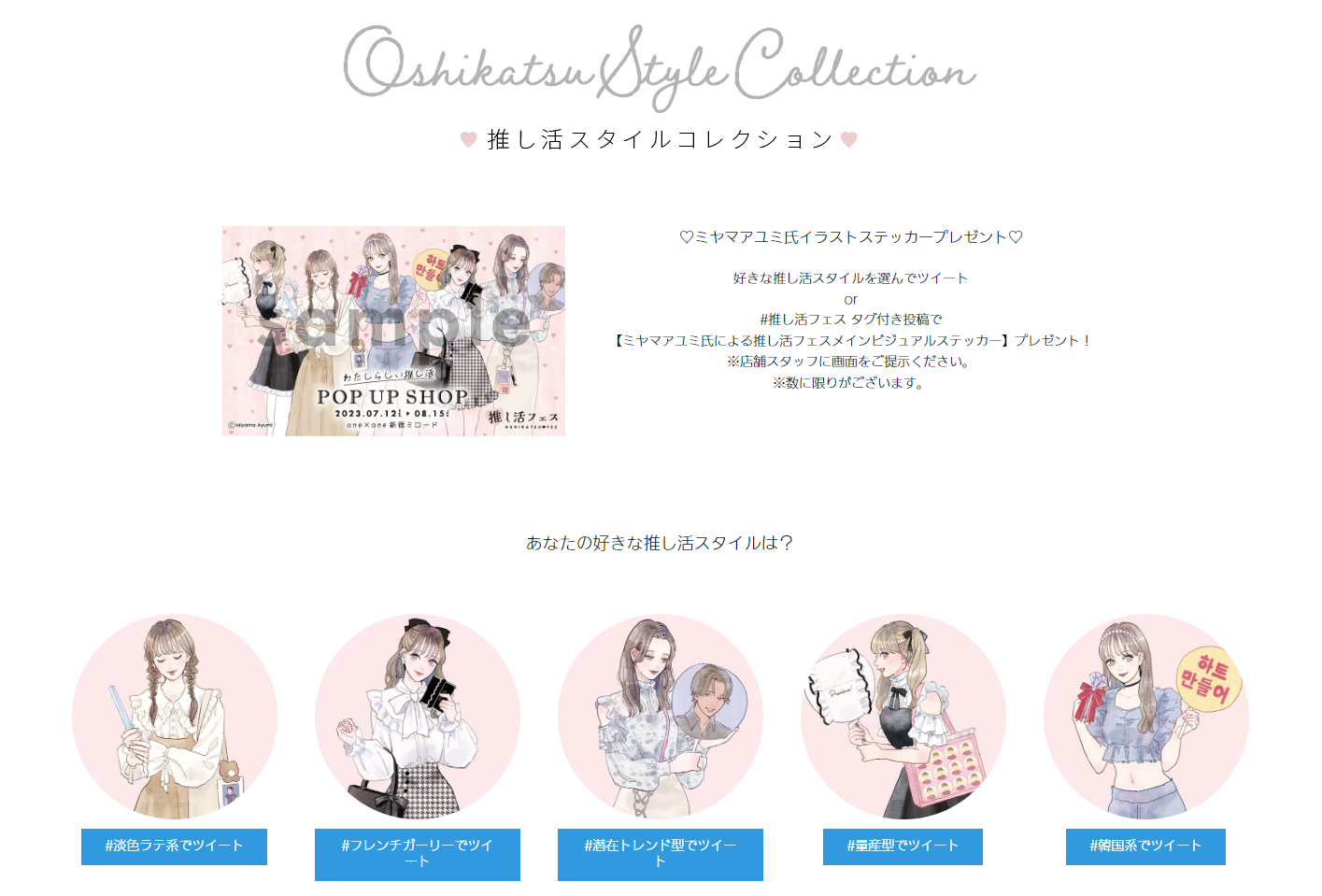 WEBコンテンツ「推し活STYLE COLLECTION」を選んでツイート、または店内や戦利品の写真を「#推し活フェス」のハッシュタグを付けてSNS(Twitter、Instagram等)でシェアしてくれた方に、ミヤマアユミ氏描き下ろしのイベントメインビジュアルのステッカーを先着でプレゼント。
