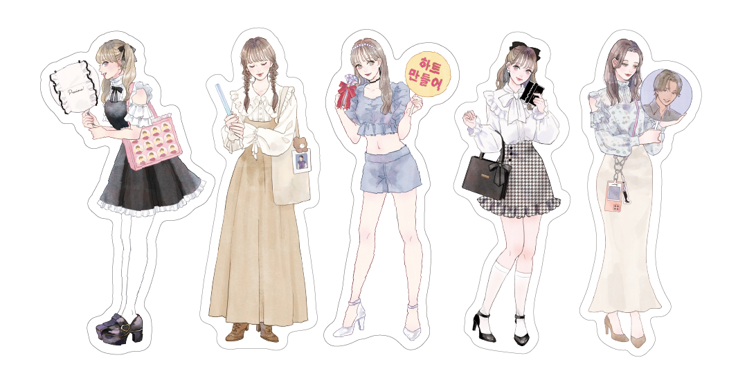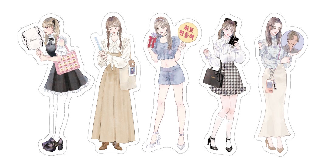 POPUP商品を税込2,000円ご購入ごとに、ミヤマアユミ氏描き下ろし「推し活女子」ステッカーを1枚プレゼント。5タイプの推し活女子の中から、お好きな柄をお選びいただけます。