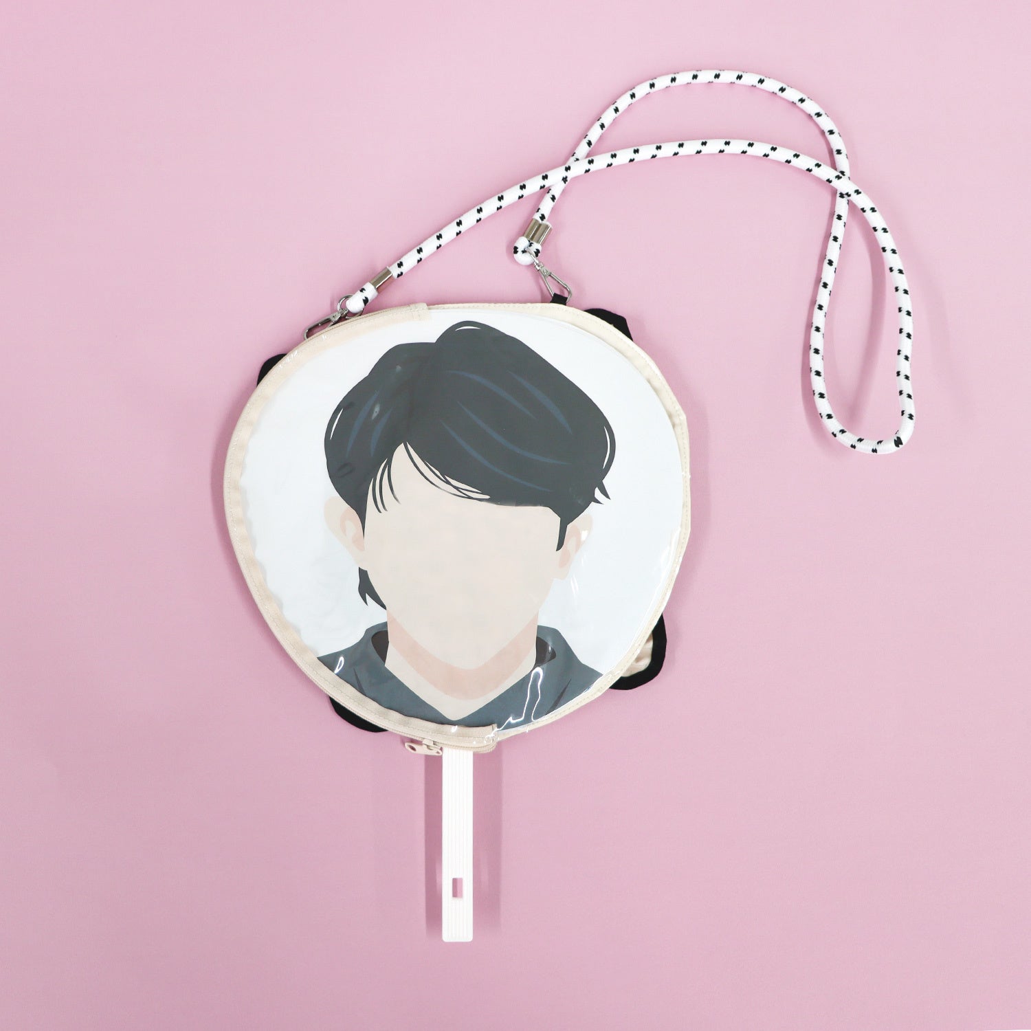 ジャンボうちわの柄が飛び出ず、ファスナーポケットが付いた推し活用のマチ付トートバッグ。バッグの表には推しのブロマイドやグッズを入れられるクリアーポケット付き。また、キャリーケースに乗せて持ち運びできる仕様のため、遠征時にも活躍します。