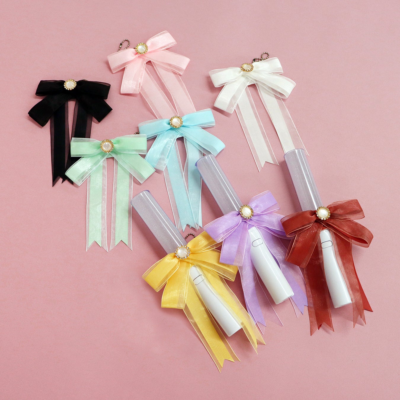 全8カラーのペンライト用リボン。リボン背面のゴムを通すだけで、簡単に装着できます。直径が約2cm~4cmまでのペンライトに対応しています。また、バッグに付けられるボールチェーン付き。持ち手やDカン部分に取り付けて、推しカラーで可愛くデコレーションできます。