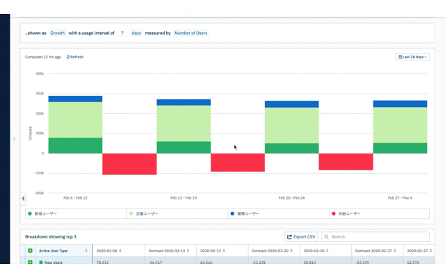 以下は、Amplitude の Lyfecycle チャートで、ユーザの状態を 新規 | 定着 | 復帰 | 休眠 に分類したものになります。