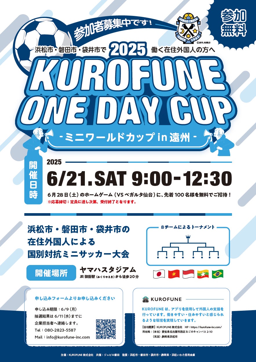KUROFUNE株式会社(本社:愛知県名古屋市、代表取締役:倉片稜、以下 KUROFUNE)は株式会社ジュビロ(本社:静岡県磐田市、代表取締役社長:浜浦幸光、以下ジュビロ磐田)と協力し、静岡県西部に住む外国人を対象に国別対抗サッカー試合を開催いたします。労働者を中心に遠州地区にて急増している外国人住民が、サッカーイベントに参加することで遠州地区に対してより愛着を持つことができることを目的としています。KUROFUNEは他社との協業を通じて、在日外国人が安心して暮らし、かつ長く働くことができる生活環境を作っていきます。
