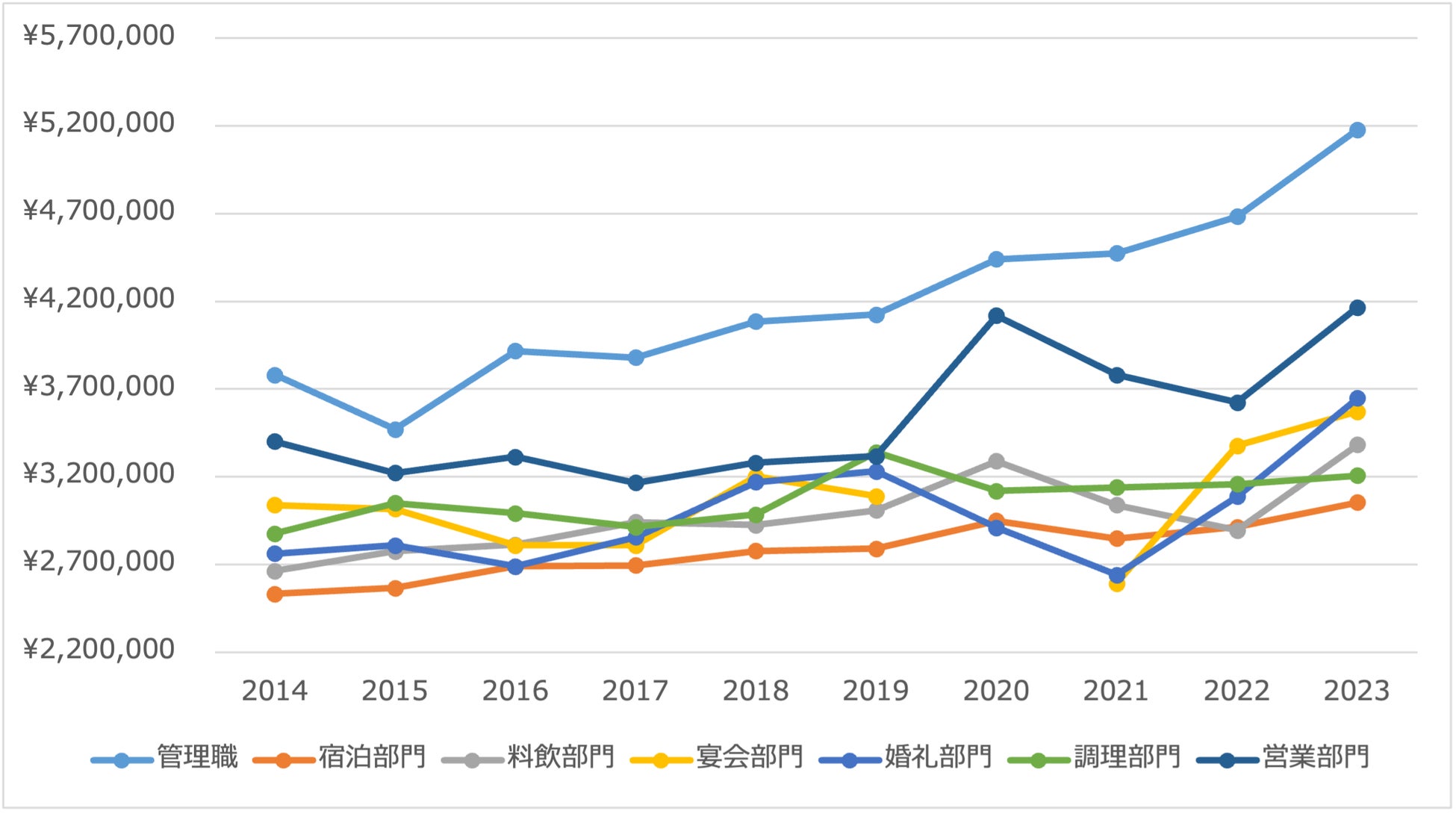 ホテル求人ドットコムの採用時の職種を「管理職」「宿泊部門」「料飲部門」「宴会部門」「婚礼部門」「調理部門」「営業部門」でカテゴライズして分析しました。目に留まるはGMや支配人、料理長などの管理職の採用時給与の成長率と、いわゆる現場スタッフの給与の成長率の差に驚かされます。また、新型コロナウイルス感染症パンデミック以降の優秀な営業スタッフの雇用提示額が他の部門より特異な成長をしています。営業スタッフに求められる能力も近年のデジタル化によるレベニューマネジメント能力等、従前の営業スタイルとは異なった能力を求められていることが背景にあると推測します。